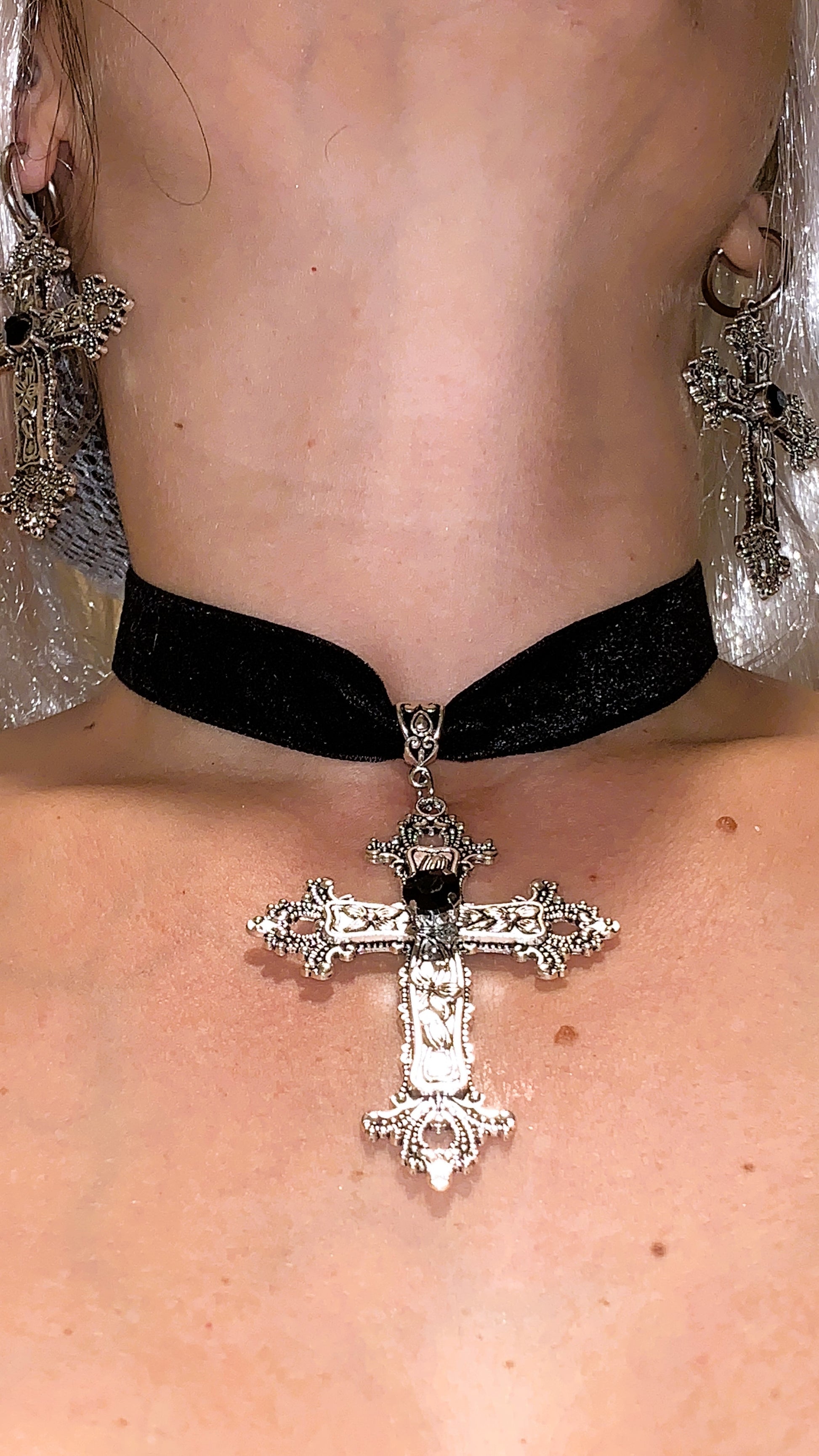 ⚜️ Choker Gótico Cruz Plateada “Dark Faith Deluxe” | Gothic Silver Cross Choker with Black Gem 💀 | Vampire Necklace Limited 1:1