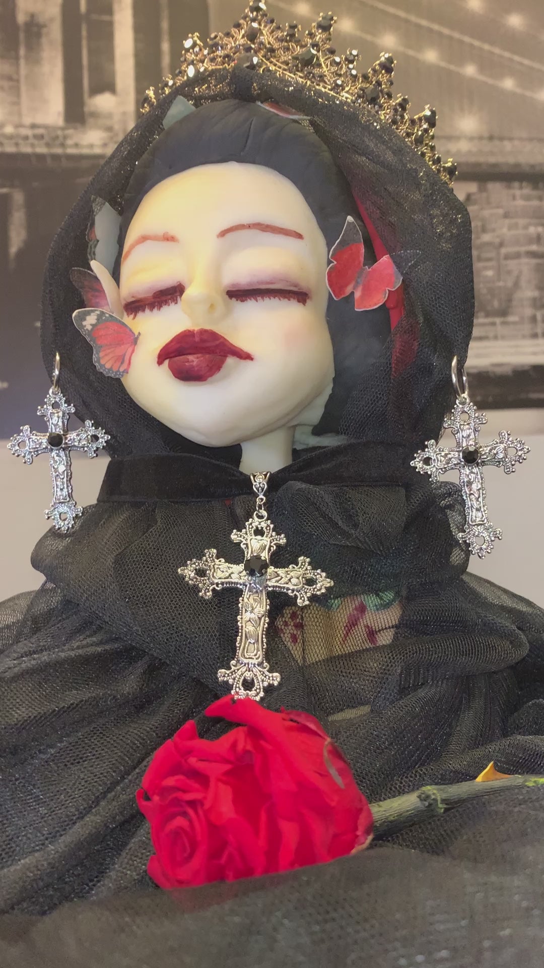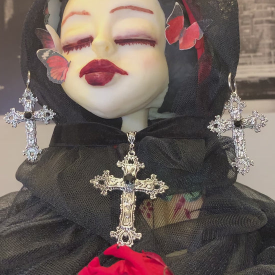 Su cruz central, tallada con detalles barrocos y una gema negra incrustada, refleja una estética gótica refinada, perfecta para quienes viven la oscuridad con clase.