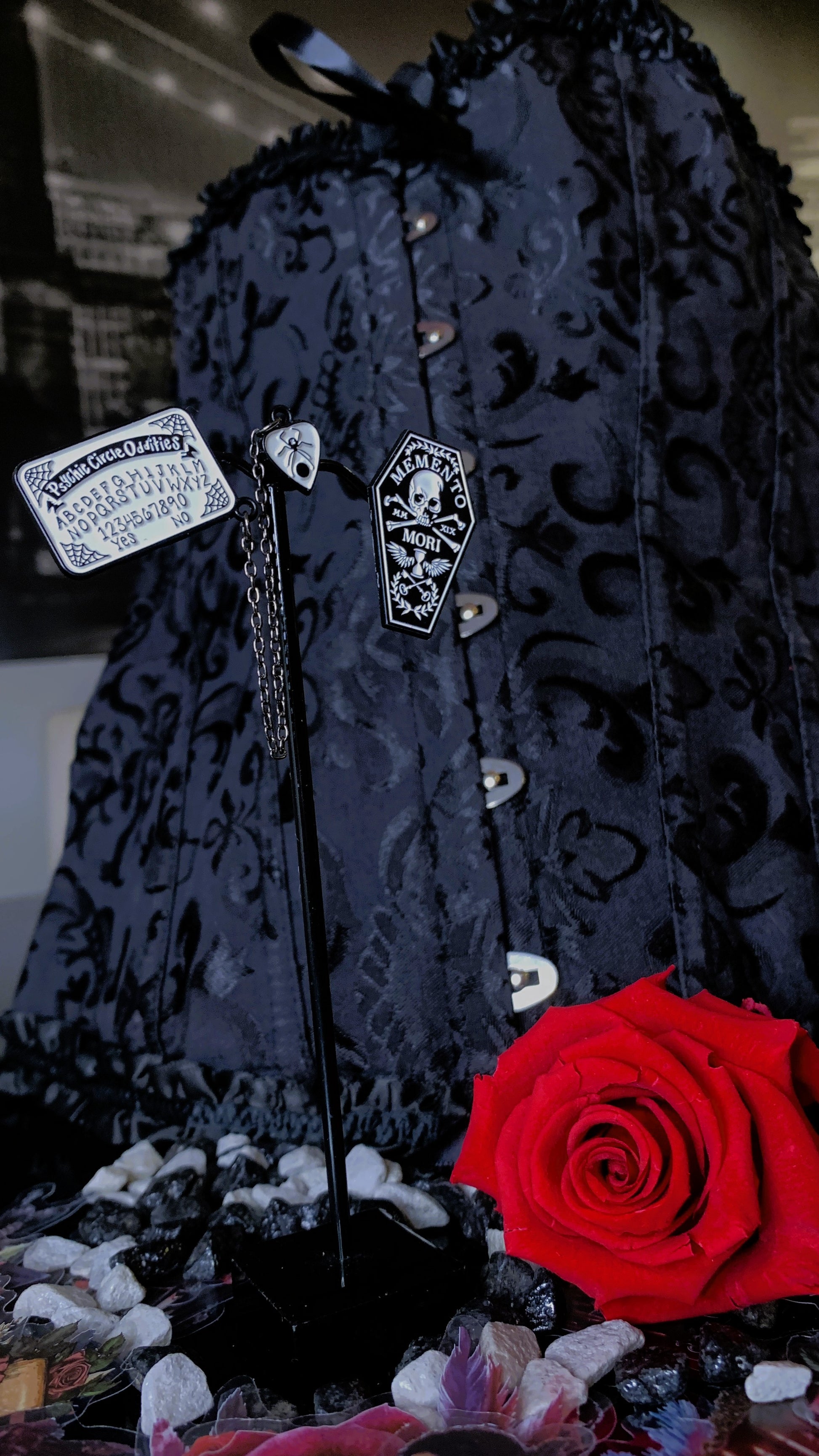 Cada pin combina misterio, historia y estilo, evocando la fascinación por lo oculto y la belleza de la oscuridad.