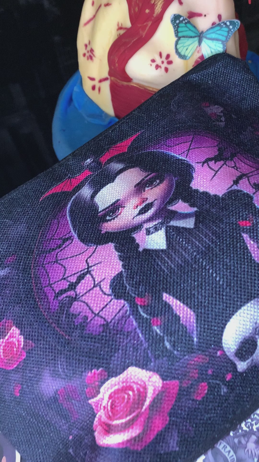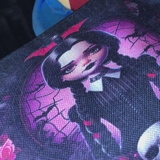 Su diseño muestra un retrato vibrante de Wednesday rodeada de rosas y murciélagos sobre fondo oscuro, mientras que su cierre exclusivo en forma de tablilla Ouija metálica aporta el toque final de magia y oscuridad.