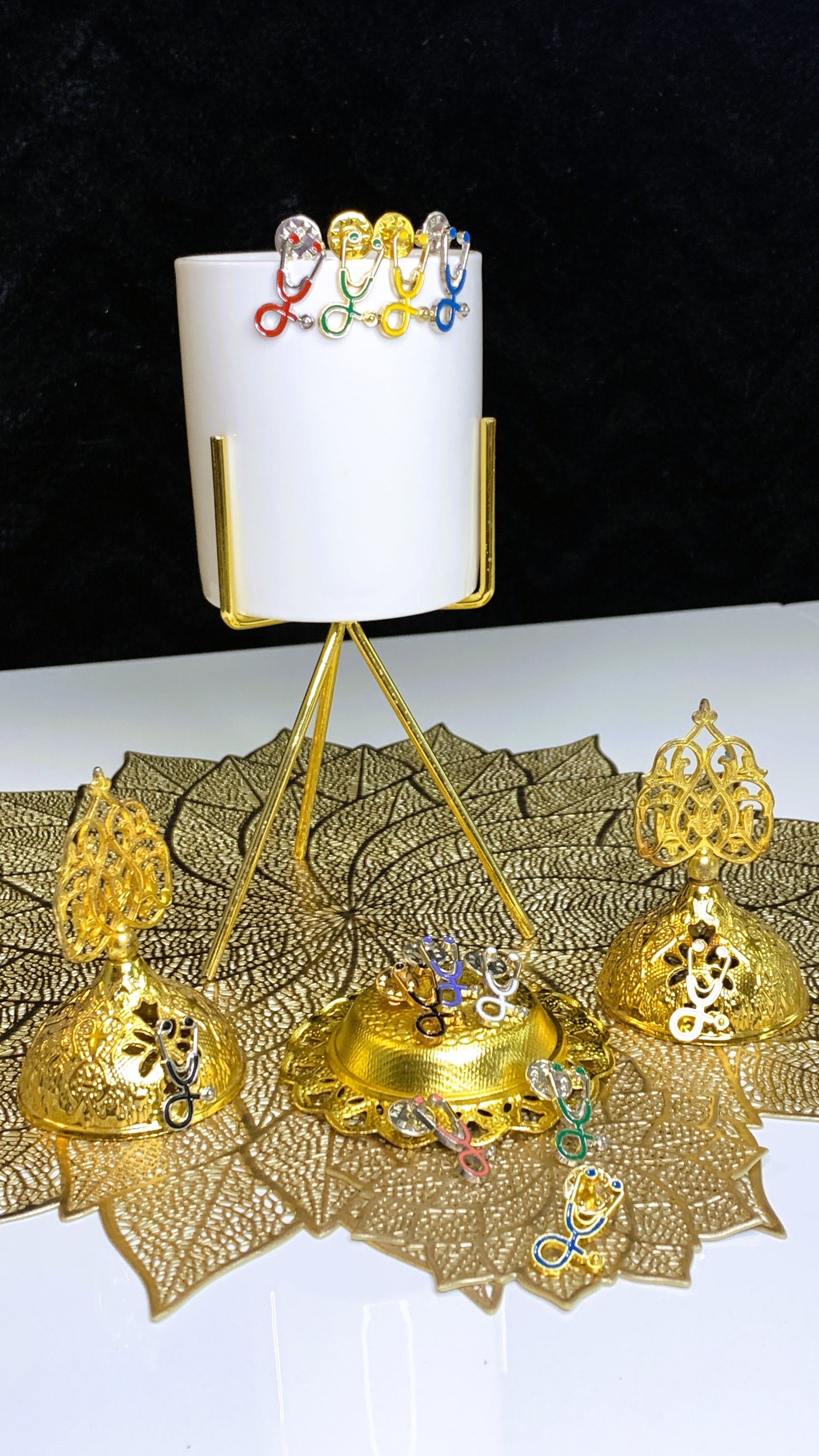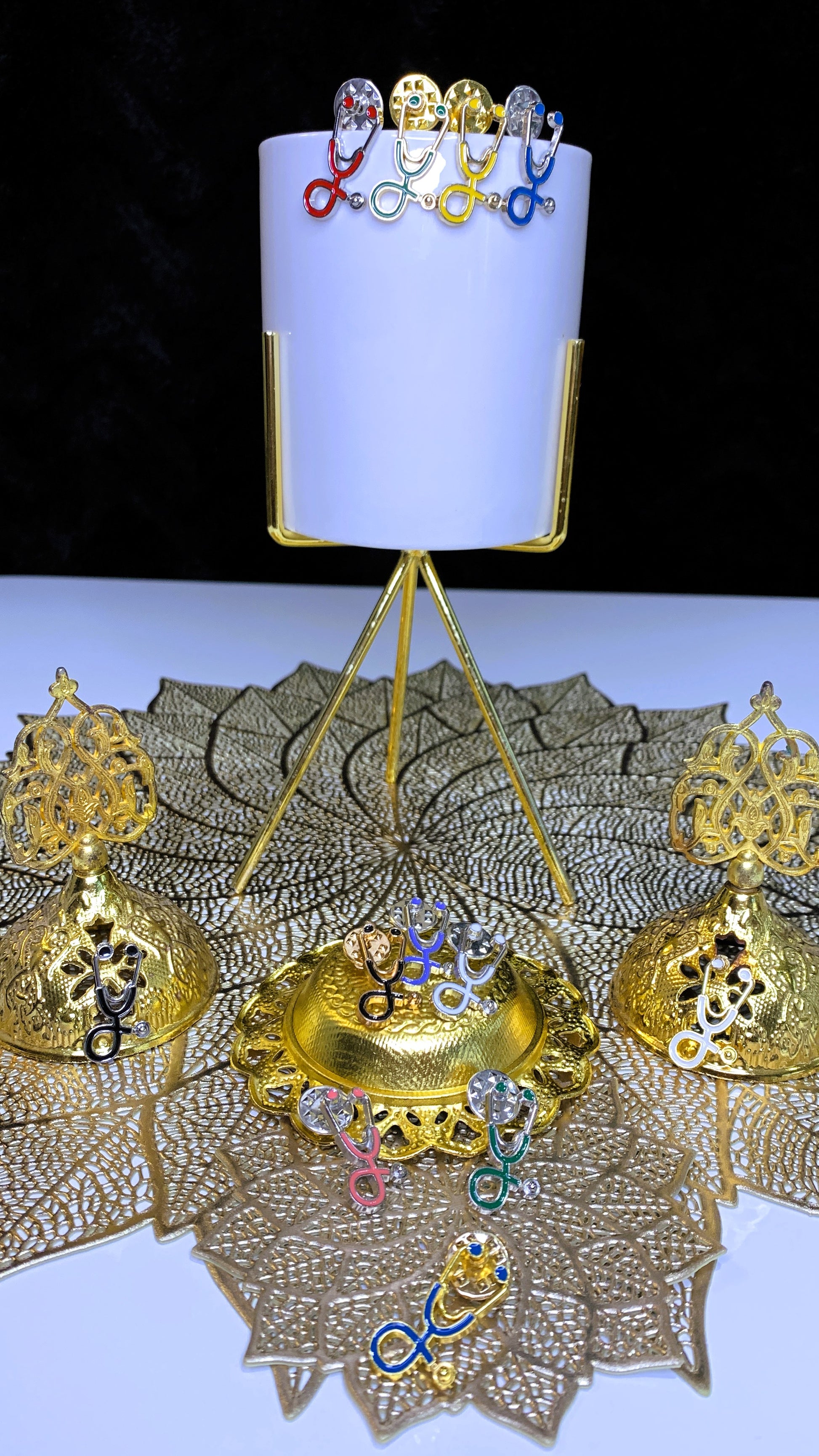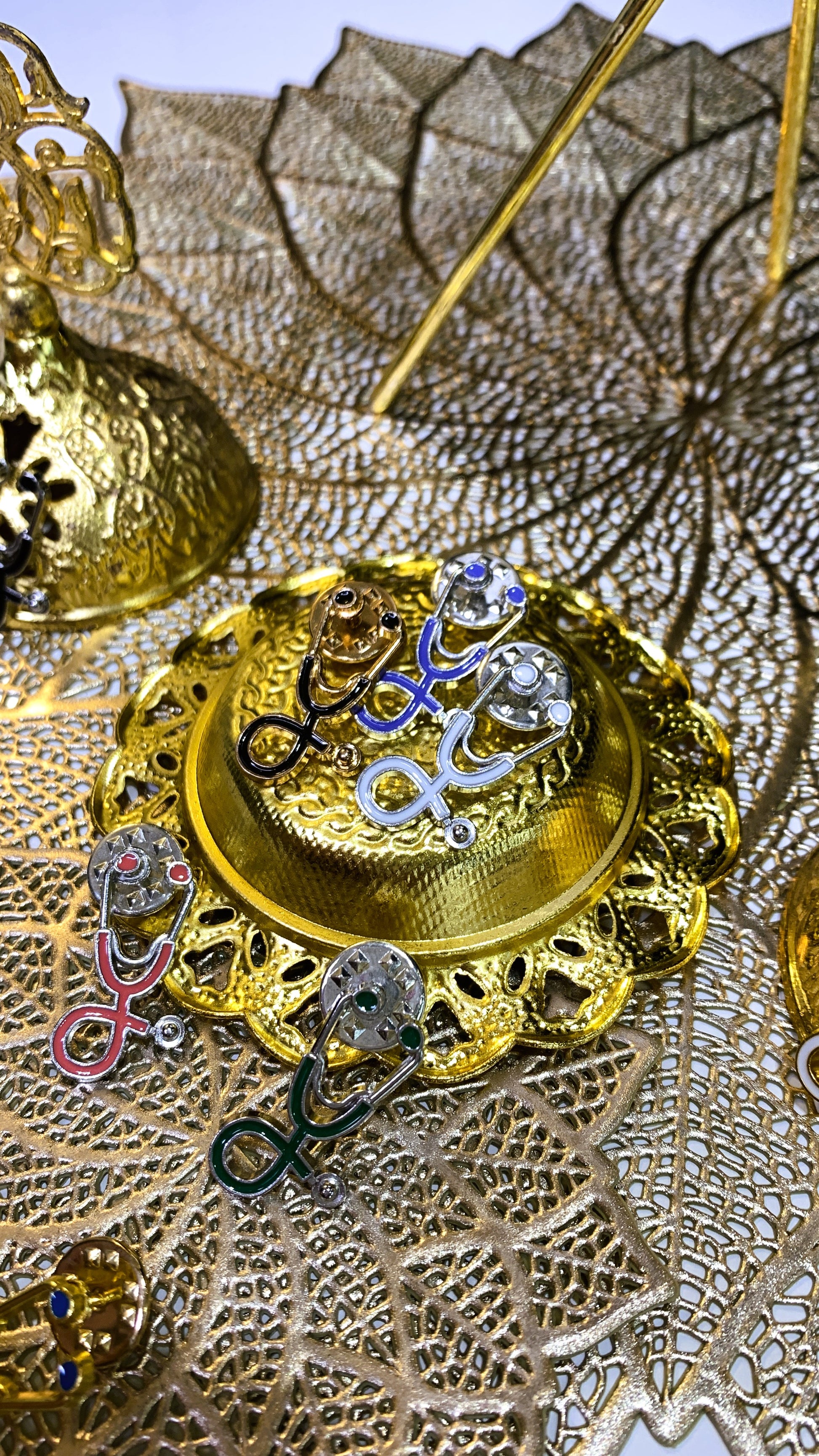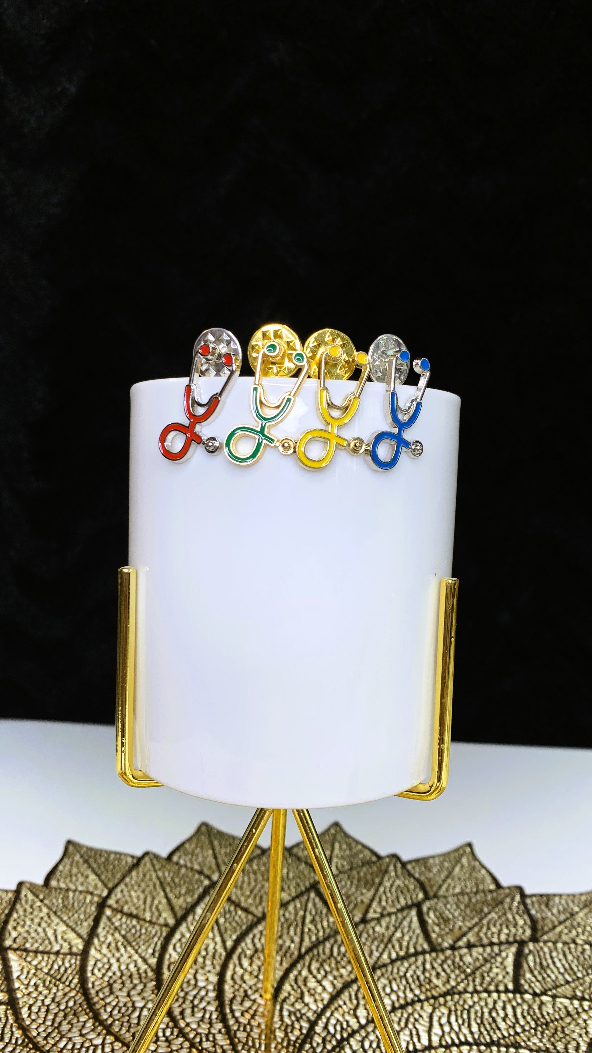 Cada pin combina formas limpias, contrastes de color y acabados metálicos dorados o plateados, creando piezas versátiles que transmiten profesionalidad, precisión y compromiso con el cuidado de la salud.