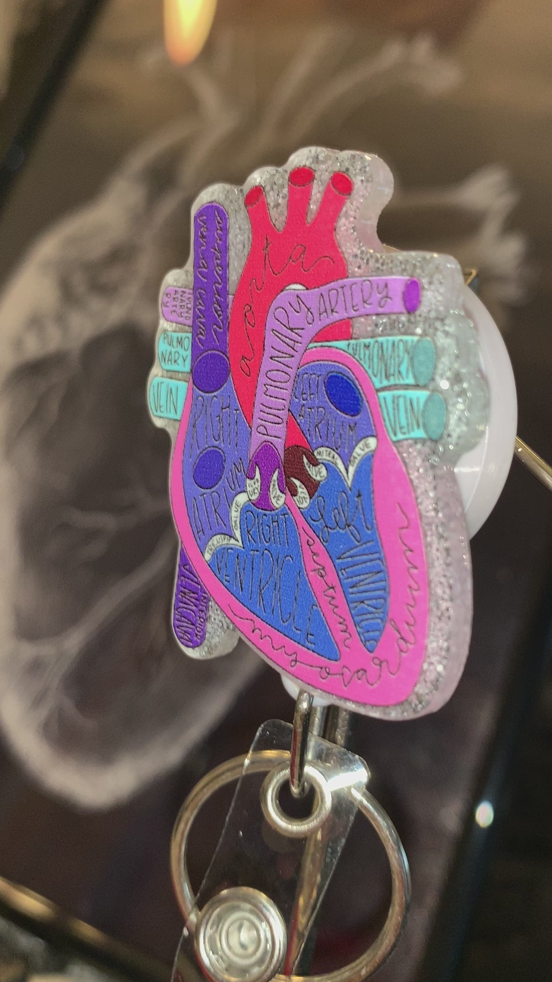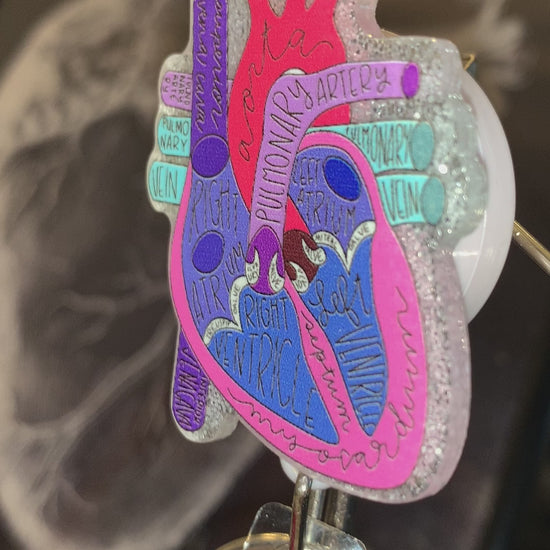 ✔️ Llavero Anatómico Brillante 🌈 – con detalles médicos de cámaras, venas y arterias principales.