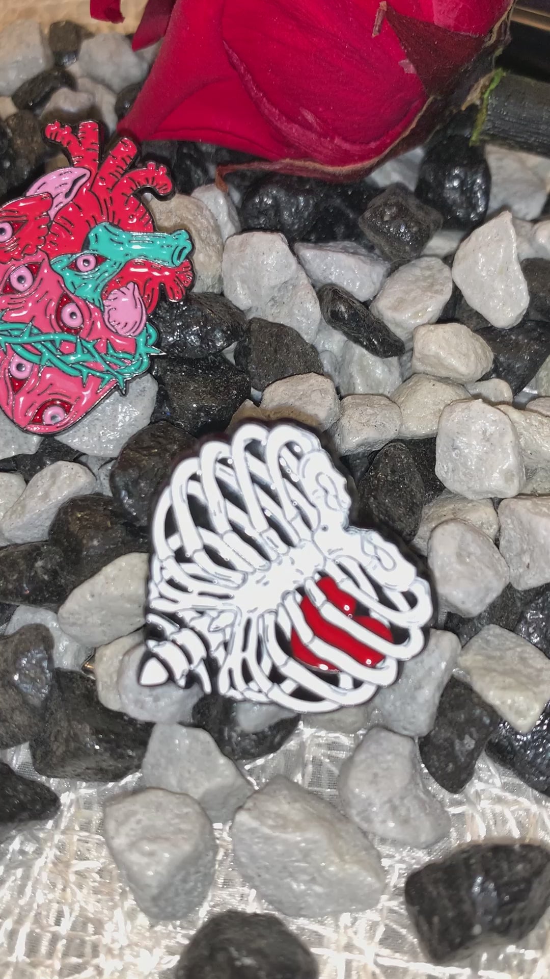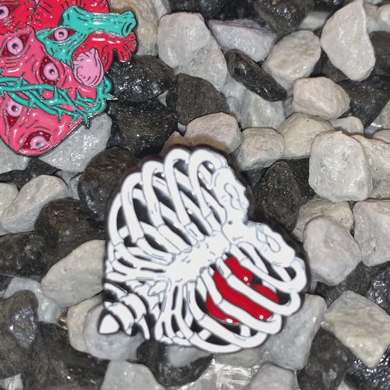 ✔️ Pin “Caged Rib Heart” – Tórax anatómico blanco con interior rojo brillante, evocando la fragilidad del alma humana 💎