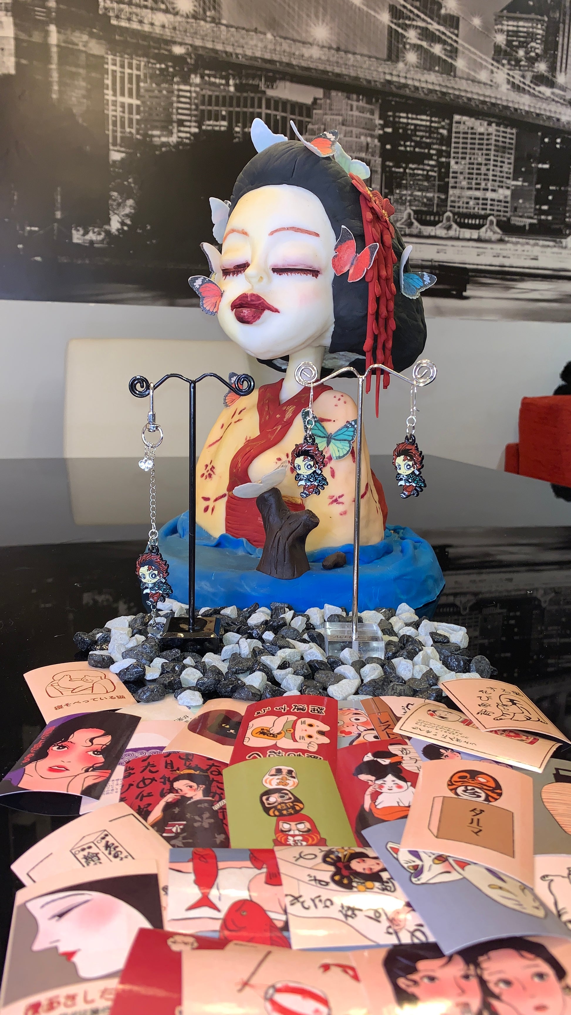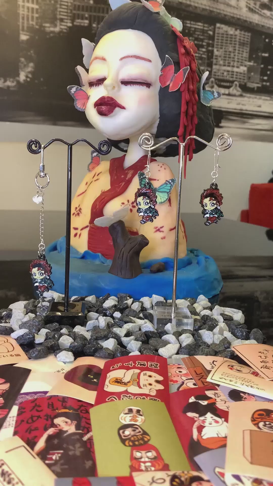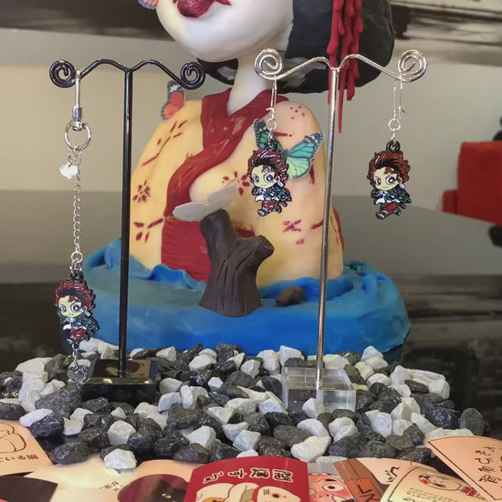 1️⃣ Pendientes (par) – diseño chibi de Tanjiro, ganchos de acero inoxidable.