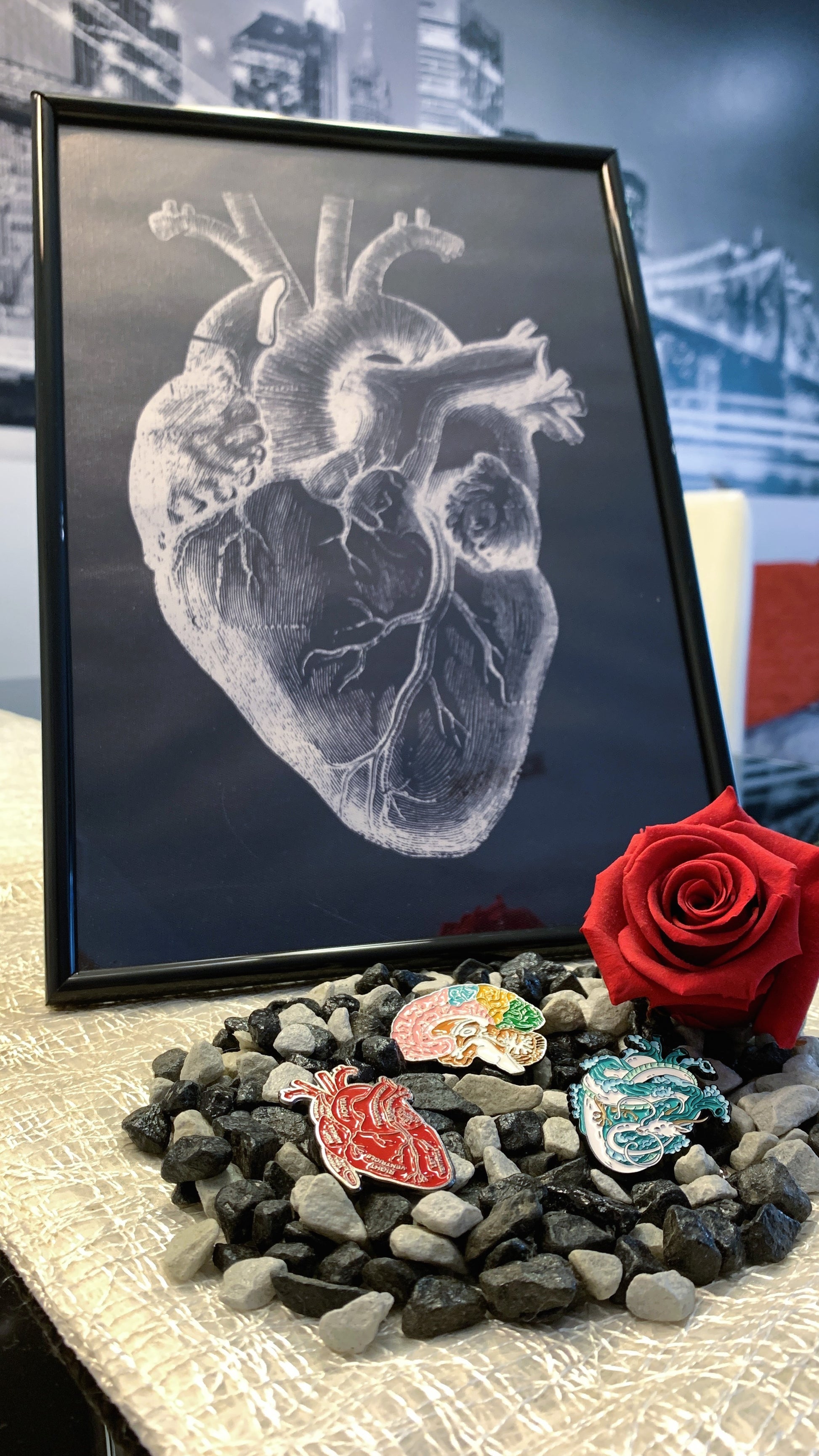 Set Maxi Pins Esmaltados (3 piezas) – Cerebro Anatómico, Corazón & Dragón Japonés | Pins Médicos & Estilo Gótico
